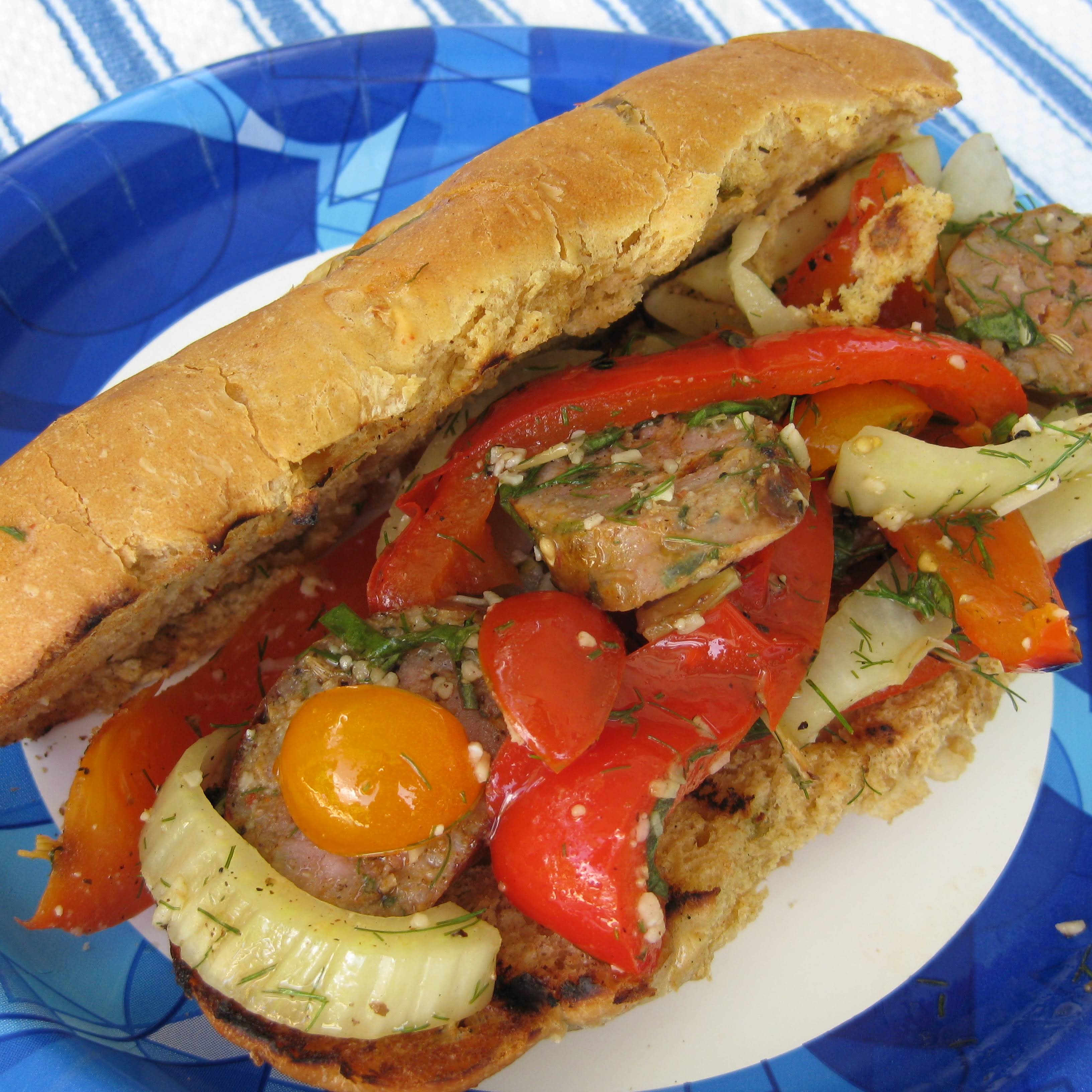 Red Pepper, Fennel And Sausage Grinder With Grinder Rolls, Red Bell Peppers, Fennel, Sausage Links, Cherry Tomatoes, Fresh Basil, Red Wine Vinegar, Olive Oil, Olive Oil, Shredded Parmesan, Salt, Pepper